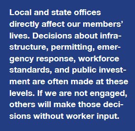 Another important point: local and state offices directly affect our members’ lives. Decisions about infrastructure, permitting, emergency response, workforce standards, and public investment are often made at these levels. If we are not engaged, others will make those decisions without worker input.